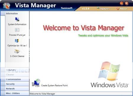Vista Manager 2.0.5 là phần mềm mạnh mẽ, tiện ích tất cả trong một nhằm tối ưu, tinh chỉnh, và dọn dẹp cho Windows Vista. Ứng dụng bao gồm hơn 20 tiện ích khác nhau trong một gói cài đặt duy nhất! Truy xuất tới hàng trăm tùy chọn ẩn để cải thiện hoạt động cùng tính bảo mật cho hệ thống, dọn dẹp registry, các tập tin rác cũng như chống phân mảnh registry, tối ưu tốc độ kết nối mạng, quản lý các chương trình khởi động cùng Windows, thay đổi hình nền tự động, cùng nhiều tiện ích linh tinh khác. Có thể nói đây là công cụ đồng hành phải có cho Windows Vista.